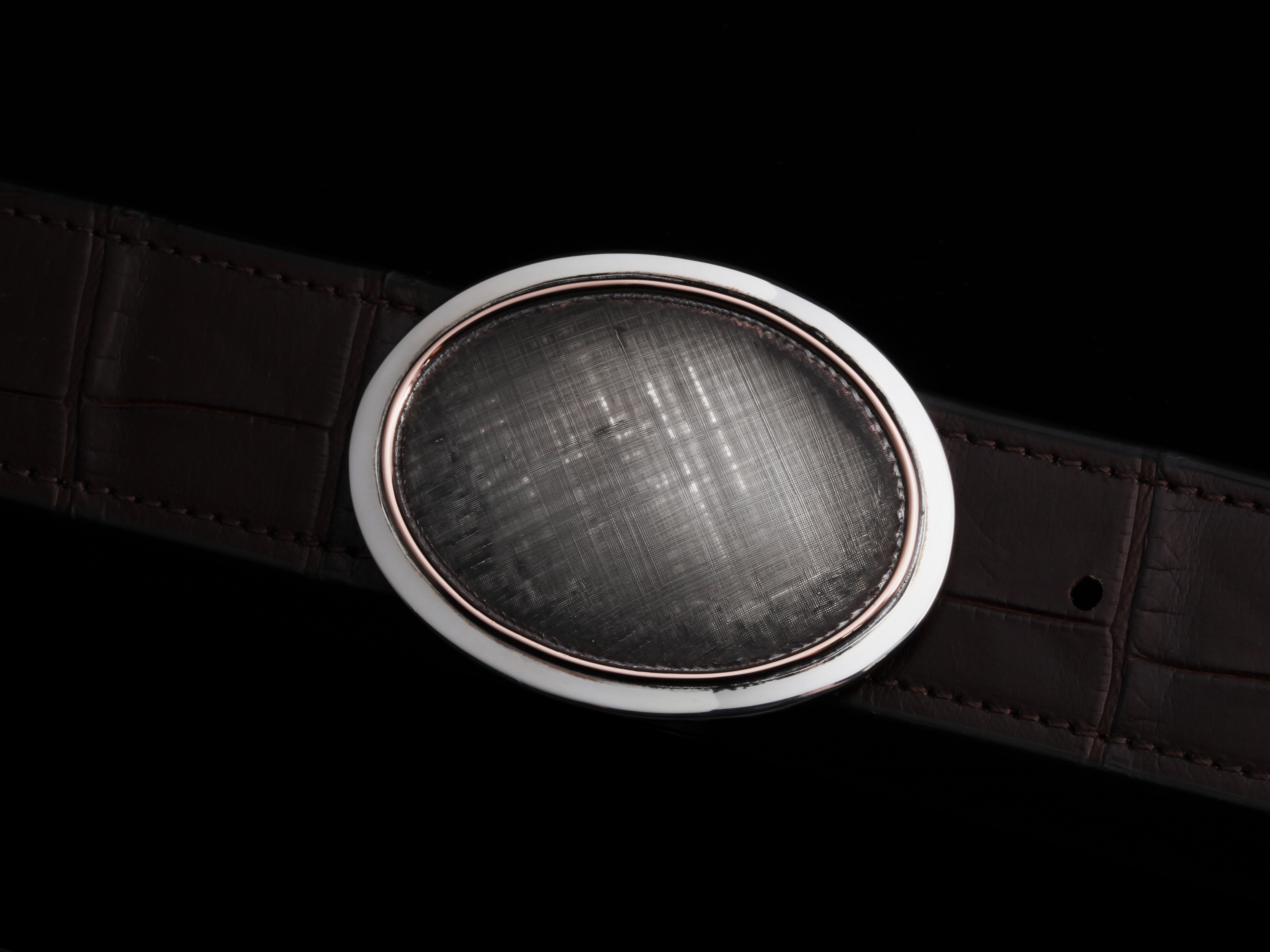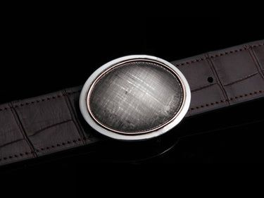 The Sutro Rangely buckle by Comstock Heritage features Florentine engraving and its size nicely accents the hand-etched, heavy gauge sterling’s bright look. The hand engraving has been framed with a 14k red gold round wire edge and a Sterling silver flat wide border. Bold, classic, and quietly confident, this is a quintessential Western-heritage piece.