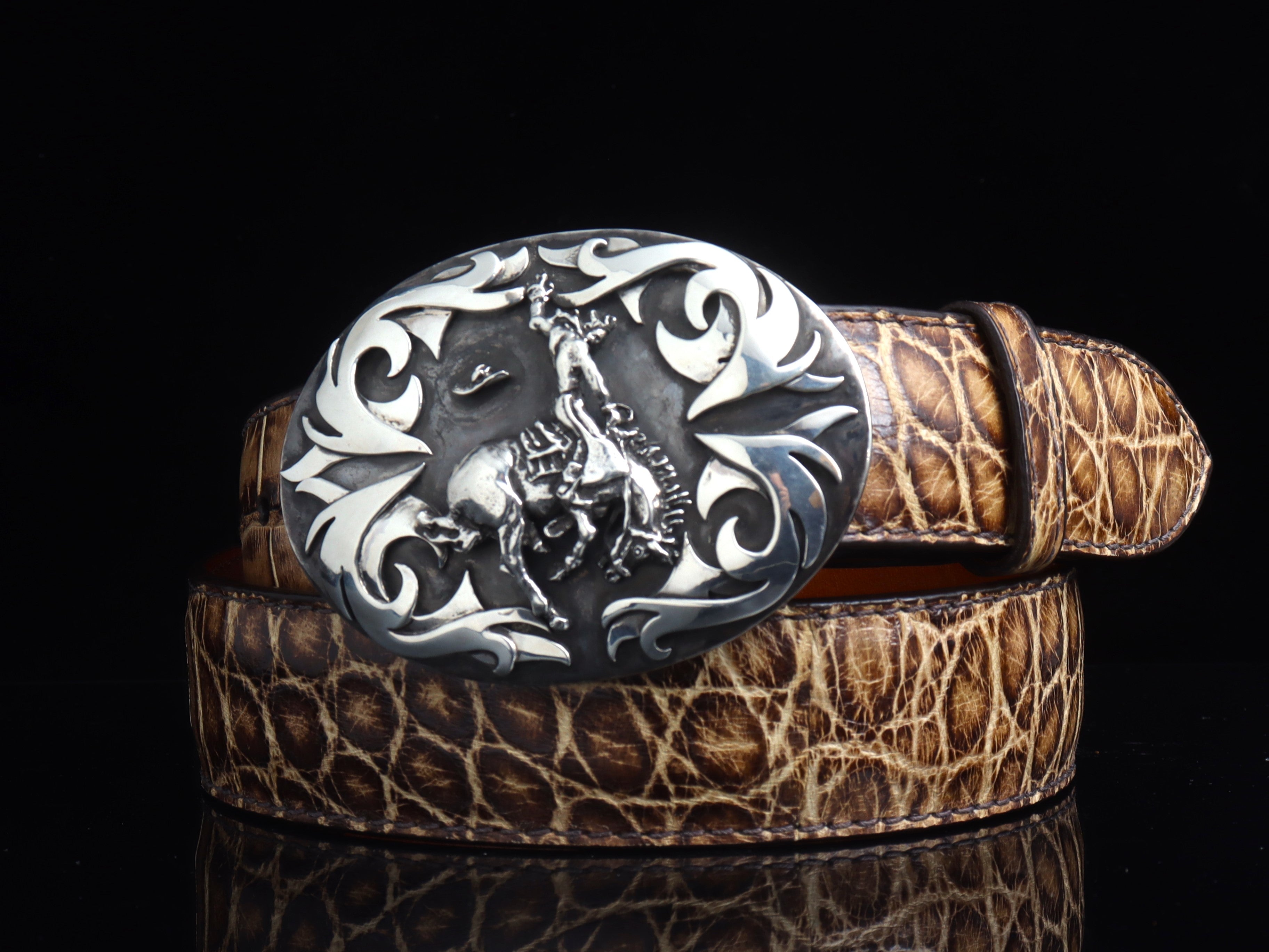 The Tribal Bronc by Comstock Heritage is a unique and masculine design on a Sterling silver belt buckle. The buckle starts with a Sterling silver "Sutro" shape base and features a Heavy Sterling silver hand cast bronc in the center that is surrounded by hand cut Sterling silver "tribal" style overlays.
