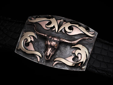 An idea from a good friend, the Tribal Longhorn 14k by Comstock Heritage is a cousin to the original Tribal Longhorn, both apart of our tribal line. Both feature unique and masculine designs on a Sterling silver belt buckle. The buckle starts with a Sterling silver "Preston" shape base and meticulously hand cut "tribal" style overlays, except this version has been upgraded to 14k yellow and rose gold. These overlays frame a hand cast 14k rose gold longhorn in the center that we have further upgraded with ¼ ct cognac diamonds in each eye.