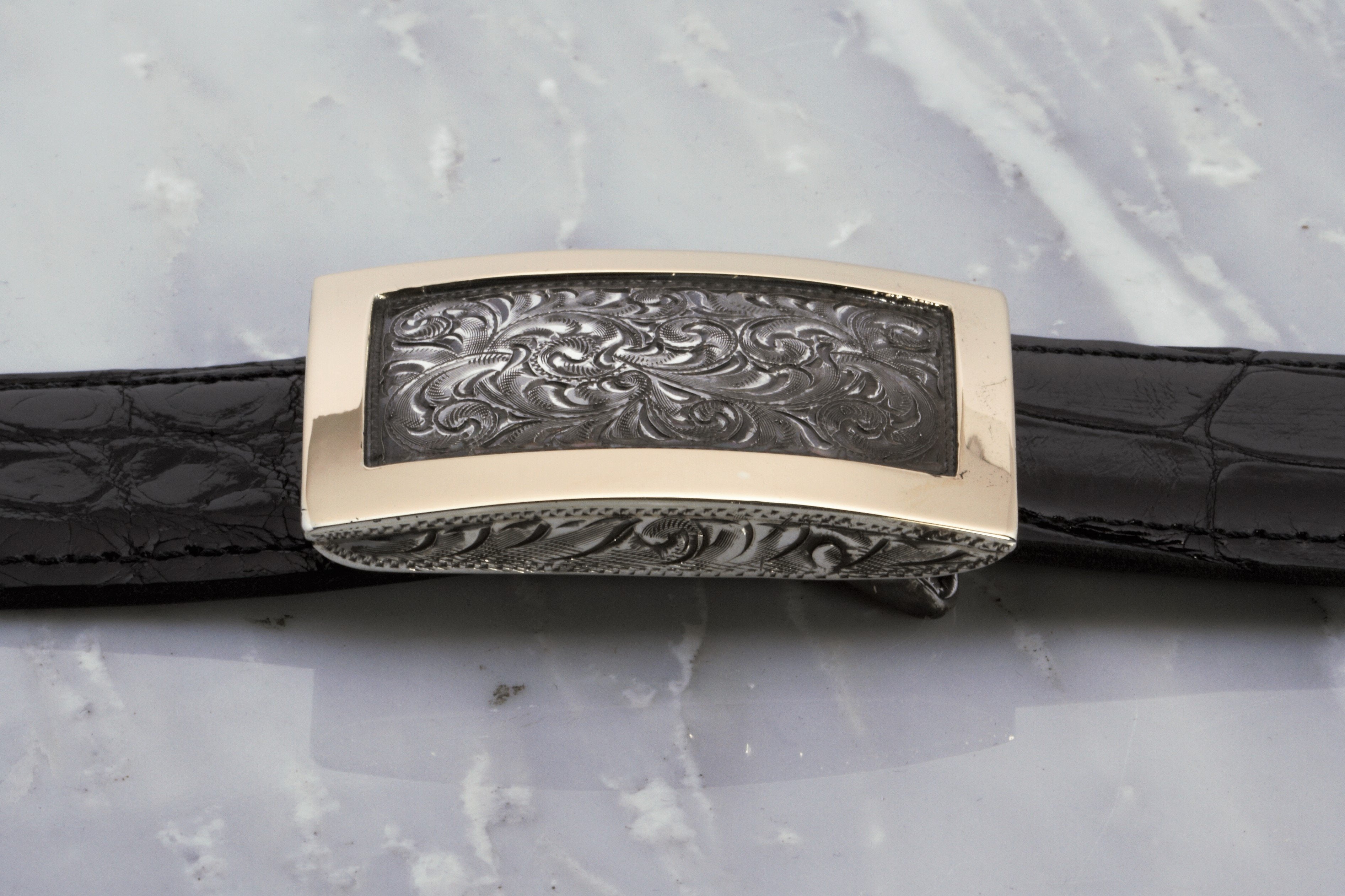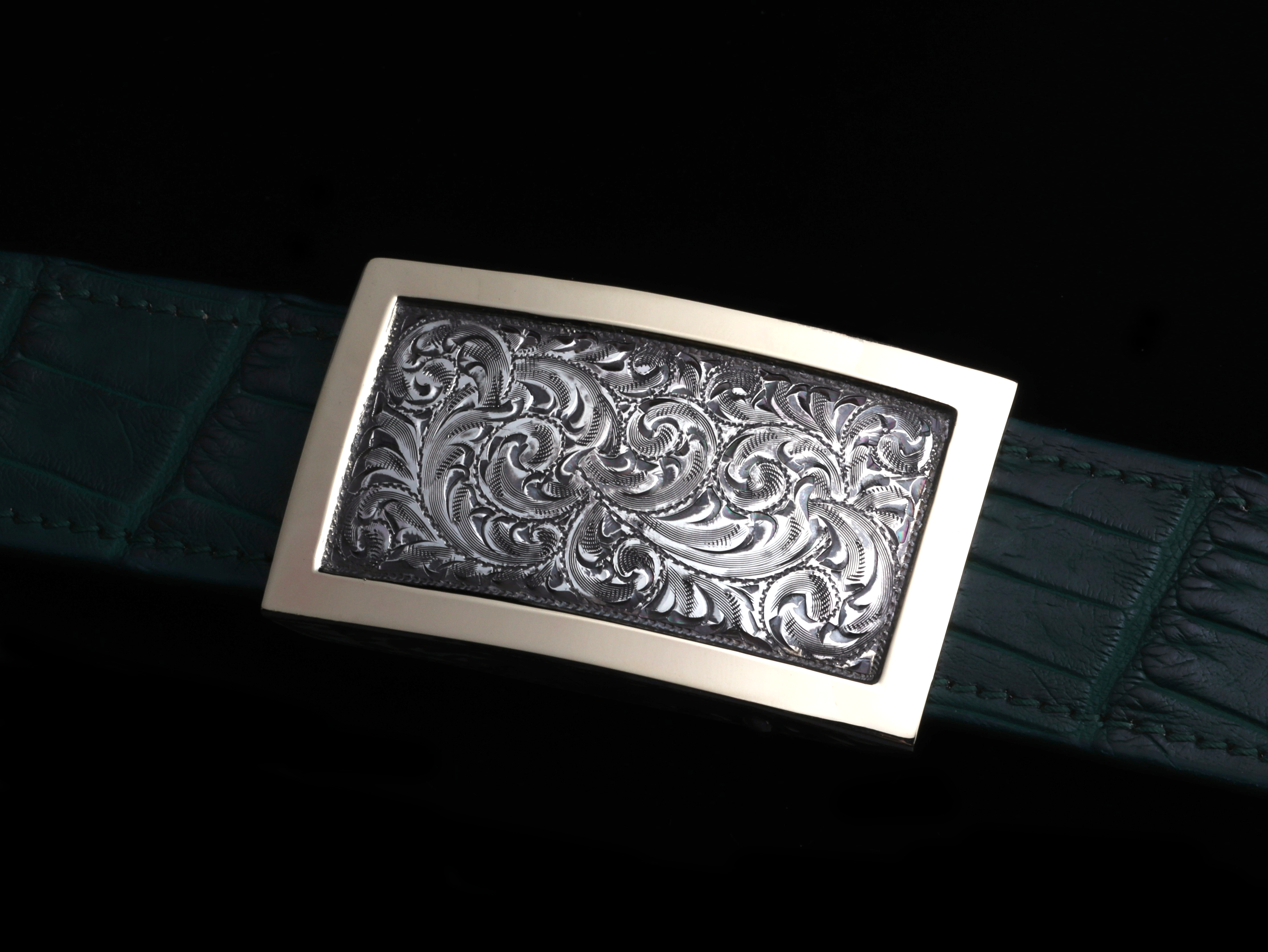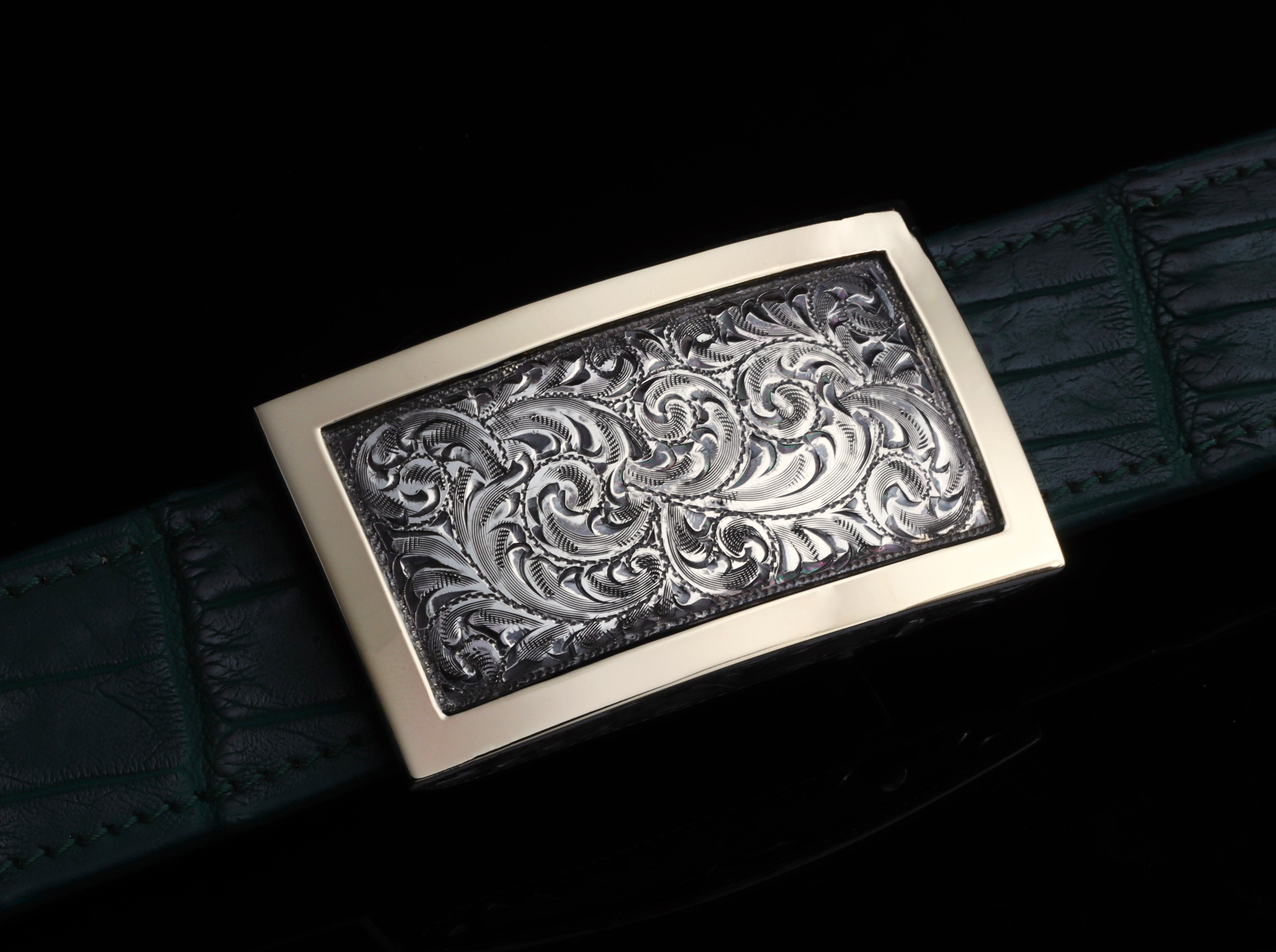 The Tyson B E 14k by Comstock Heritage is a heavy scroll engraved Sterling silver dress buckle that features rectangular curved sides as well as a large, flat 14k yellow gold border.
