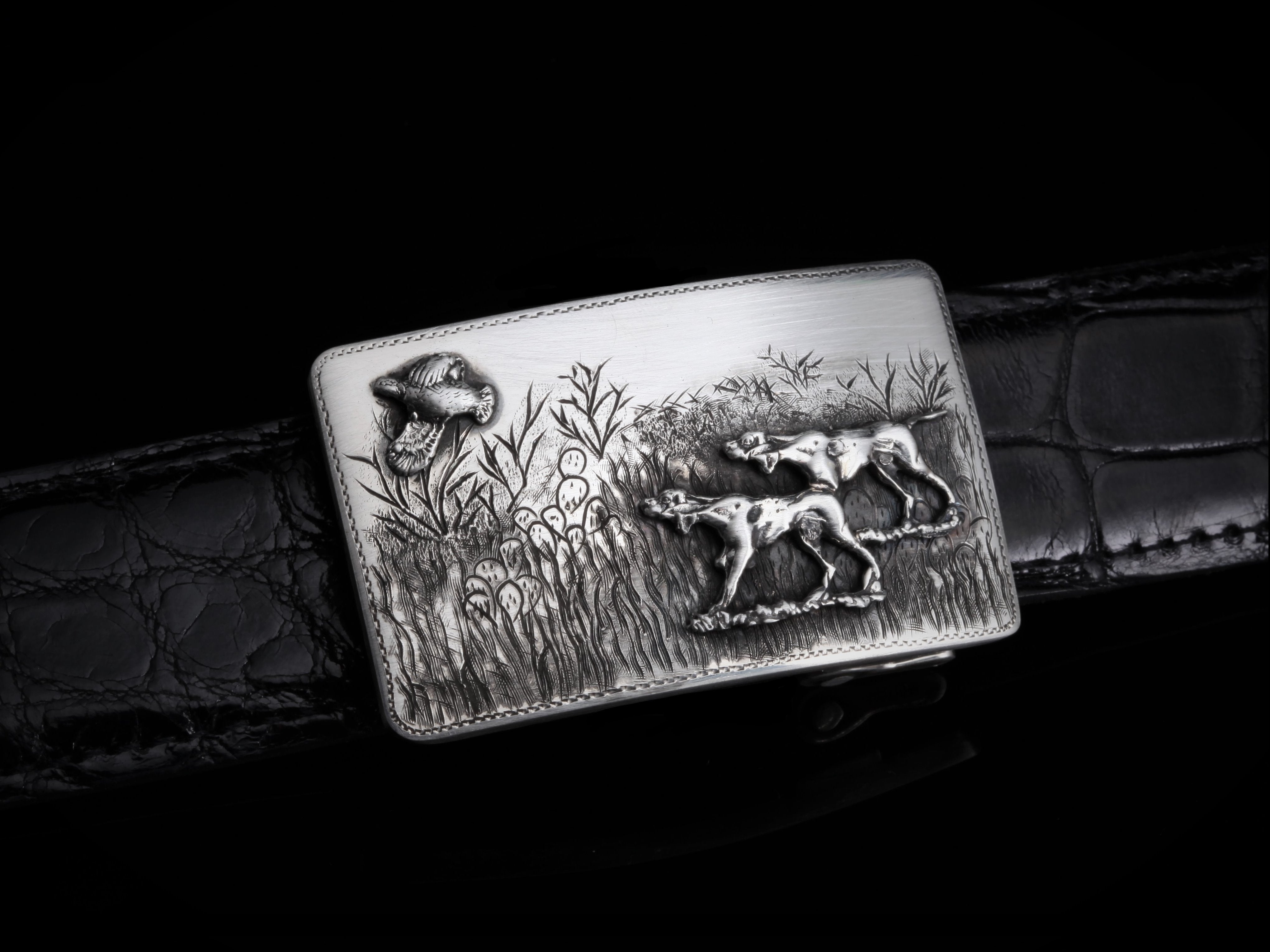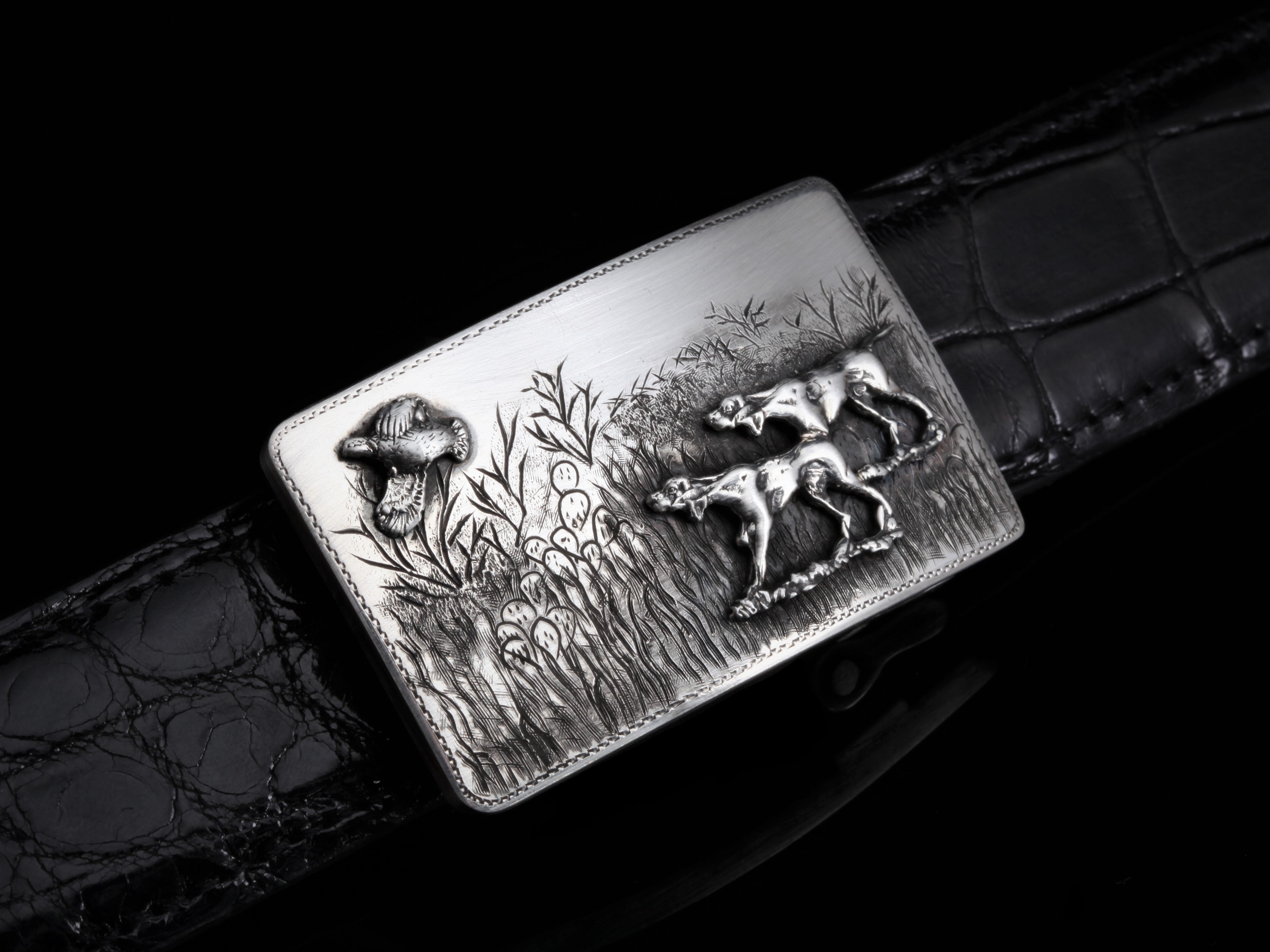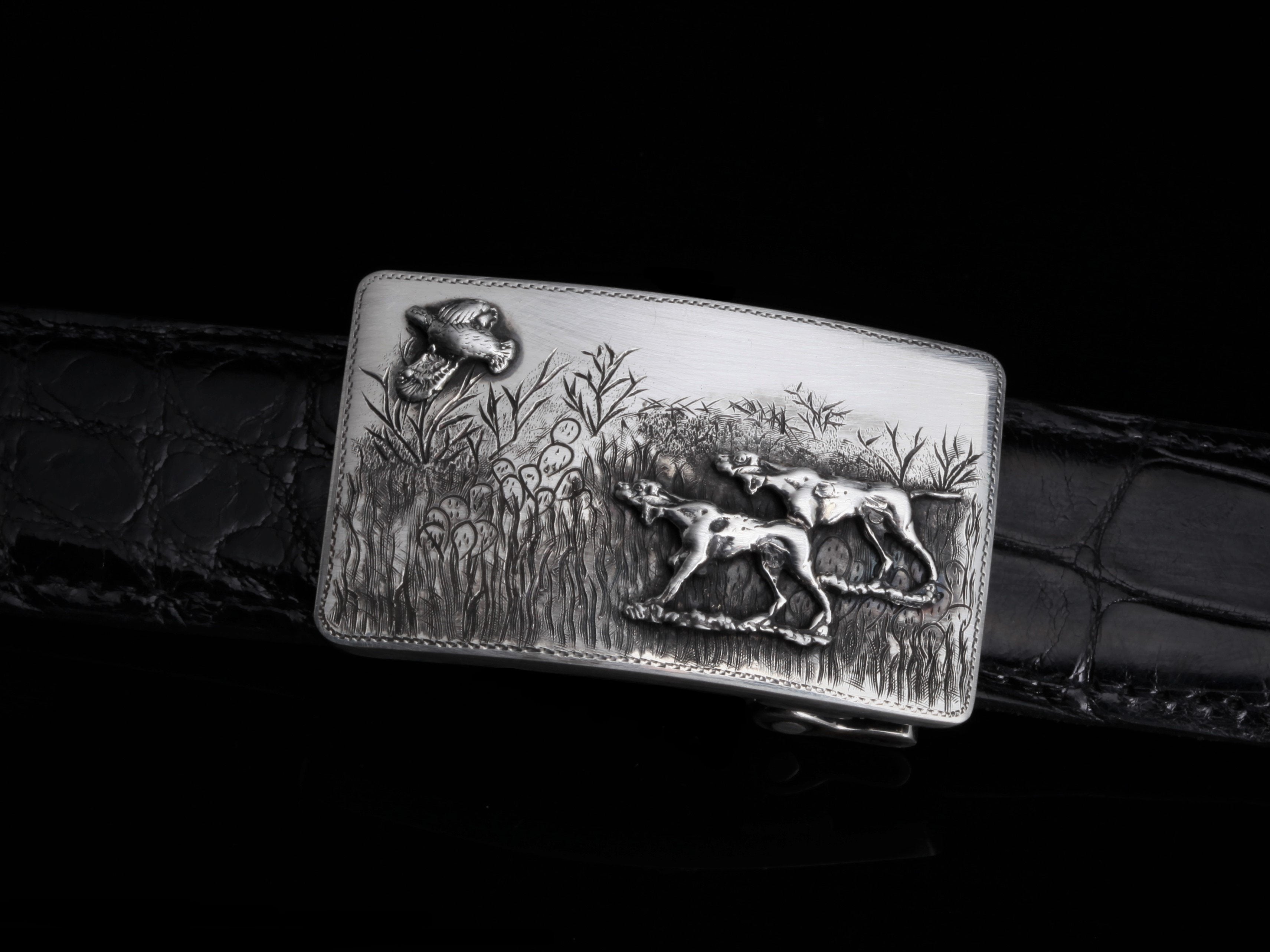 The Tyson Bird Dogs by Comstock Heritage belt buckle is a smaller, yet heavy gauge Sterling silver "Tyson" shape buckle perfect for an avid hunter. The bed of hand-engraved scenery is the perfect backdrop for a Sterling silver hand-cast pair of hunting dogs after a single matching flying quail.