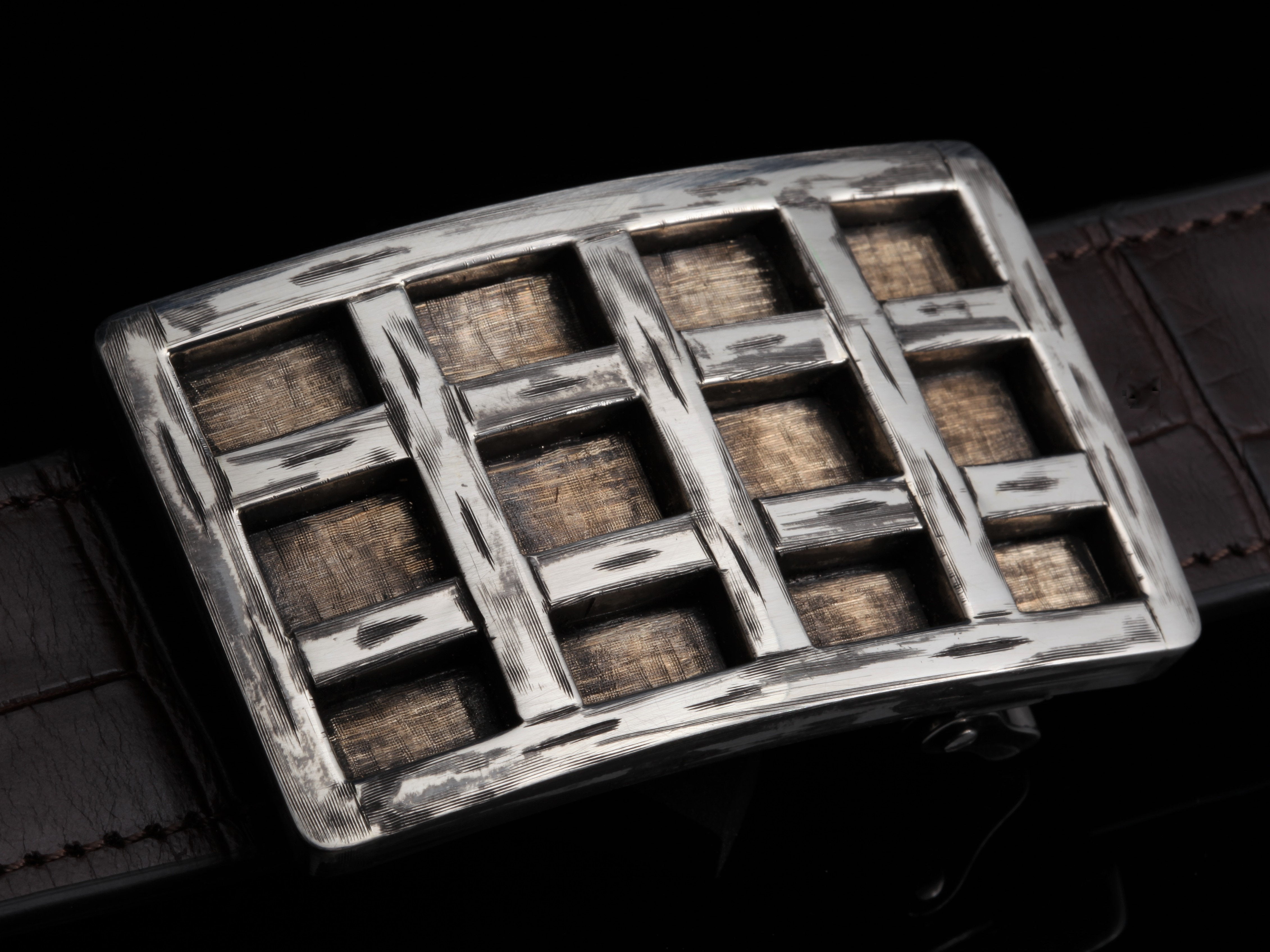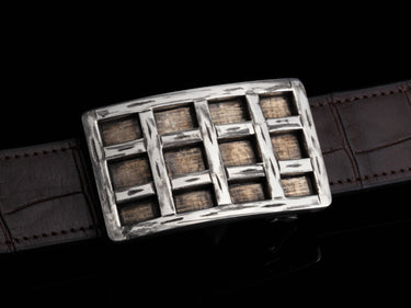 The Tyson Log Cabin 14k by Comstock Heritage is a Sterling silver belt buckle featuring hand cut, heavy gauge square wire. To create the intricate design, precise measurements are taken and then cut piece by piece to build the lattice work this buckle is known for. It is then antiqued and given a rustic look, even on the 14k gold inlaid pieces in the center.