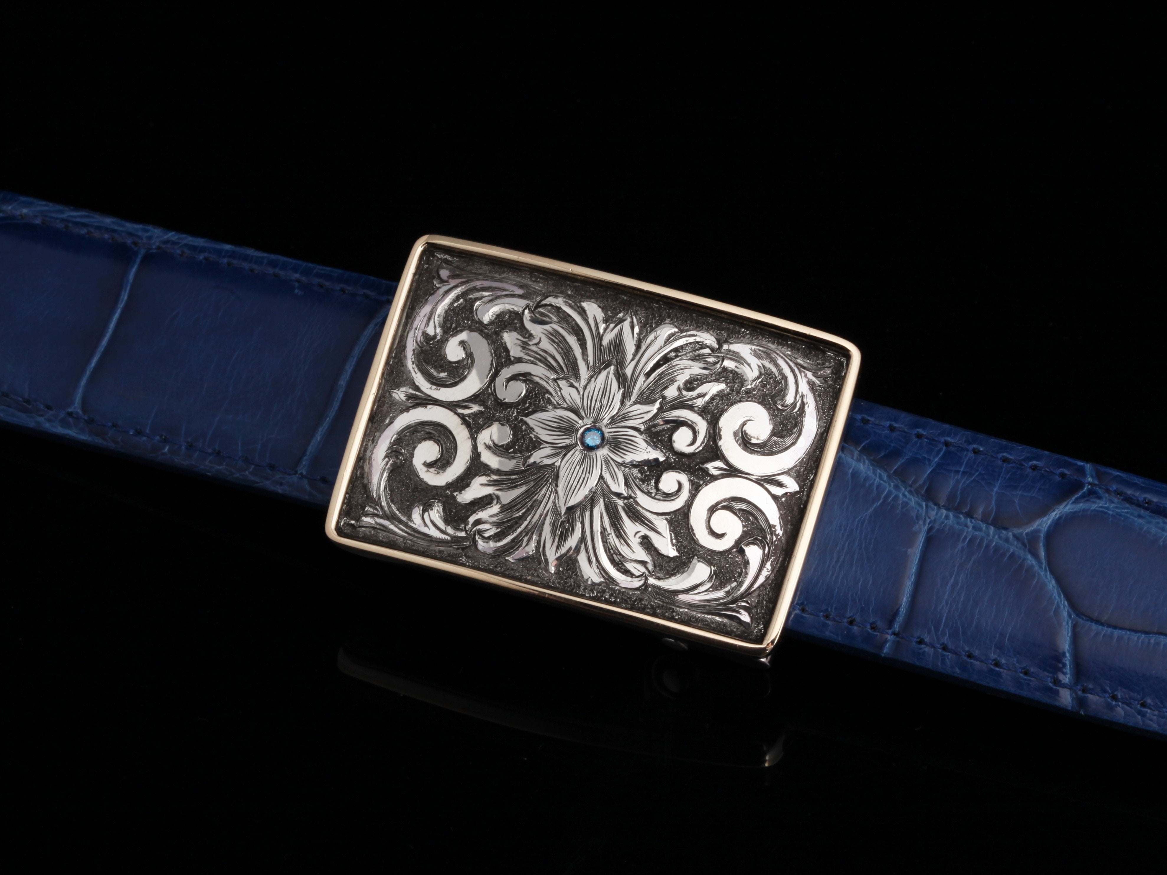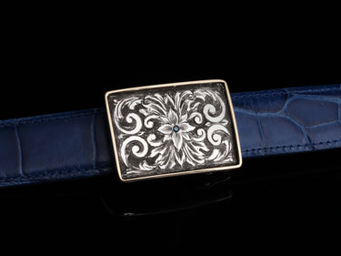 The Tyson W Henry by Comstock Heritage is a Sterling silver "Tyson" shape belt buckle featuring meticulously hand cut Sterling silver Italian style negative space engraving surrounding a blue diamond. In the negative space left from the engraving we have painted the Sterling and then polished the top to set it. Framing this piece is a 14k yellow gold hand formed wire.