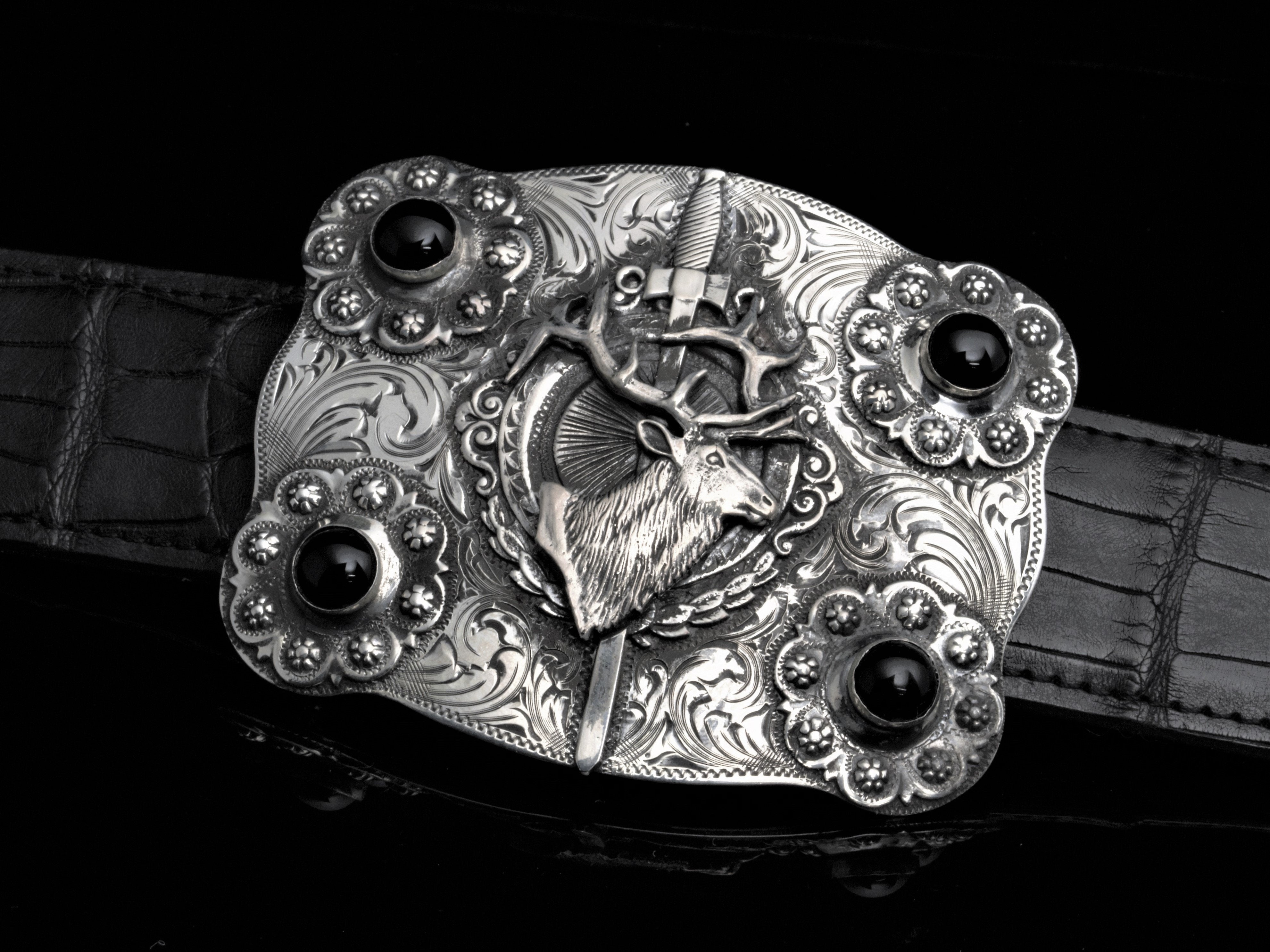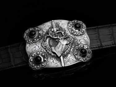 The Yuma Elk by Comstock Heritage is a Sterling silver rectangle scalloped edge buckle with intricate hand engraving throughout. Black onyx has been placed in each corner among die cut conchos, and the center is an elk, shield and sworn figure to match. This buckle has then been antiqued and polished for a darker finish.